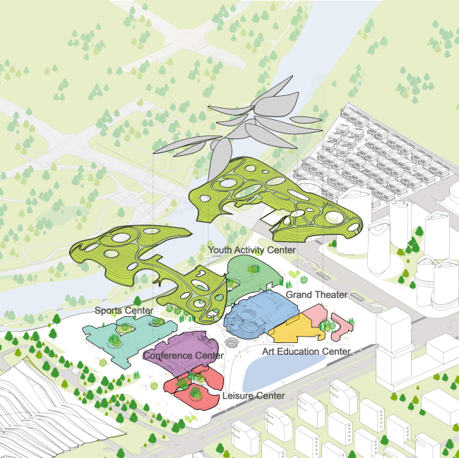 Внушительную территорию в 14,9 га займут сразу шесть объектов: большой театр на 1300 мест, конференц-центр, главный зал которого вместит 2000 слушателей, центры отдыха, спорта, молодежи и художественного образования. Общая площадь составит около 120 тыс. м2, но почти все пространства окажутся скрыты под засаженным чайными кустами и травой волнистым «покрывалом». На поверхности останутся лишь гигантские белые «листья бамбука», будто принесенные сюда ветром. «Мы исследуем уникальную ауру этой области и интегрируем ее в повседневную жизнь», – поясняет Ма Яньсун.