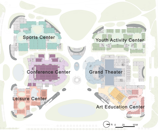 Театр и конференц-центр получат по три наземных этажа, остальные объекты будут высотой всего в один-два этажа. Тем не менее, комплекс достаточно масштабный, амбициозный и при этом скромный по своему поведению в городском пространстве. Эта архитектура на грани ленд-арта вообще не устанавливает никаких границ, а наоборот, полностью убирает их и формирует единую, всепримиряющую среду для существования человека. Здесь город, природный ландшафт и результаты созидательной деятельности человека не просто гармонично сосуществуют, а оказываются неотделимы друг от друга.
