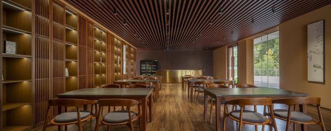 Внутри лестница-спираль и лифт служат для вертикальной связи между этажами: первым (посетительский центр, медиазона, коворкинг) и вторым (кафе и книжный бар). Выставочный центр соединен с востока с традиционным домом, превращенным в ресторан и чайную с комнатой для традиционных настольных игр.
