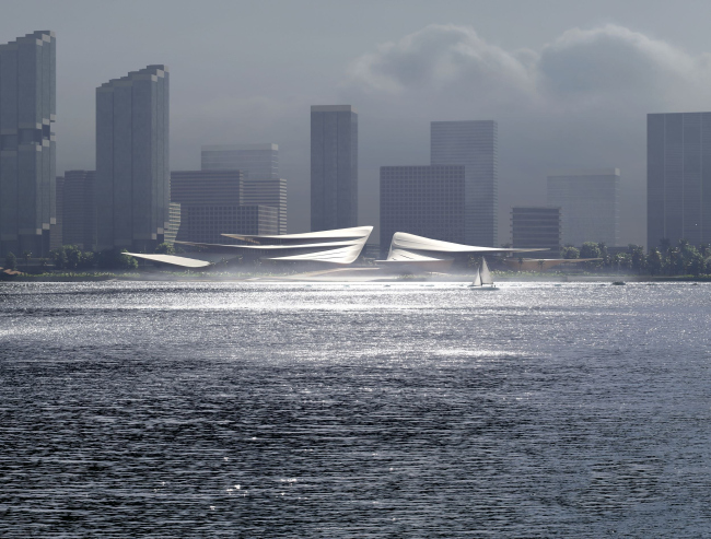 Участок разделит пополам центральная ось, «отрезающая» культурную от коммерческой программы. Главные здания, выполняющие одну и другую функции соответственно, похожи: у них многоярусные кровли с большим выносом, защищающие фасады и террасы от тропического солнца и муссонных дождей. Профиль крыш, по мысли авторов, напоминает паруса или же горы центральной части Хайнаня, на фоне которых раскинулся город Санья.