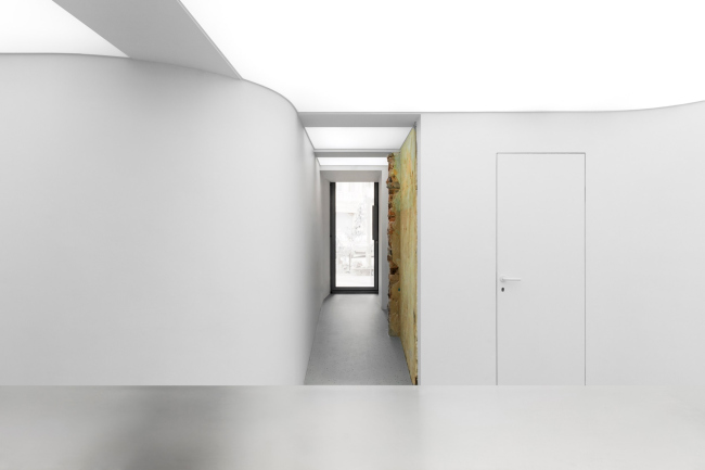 Криволинейные стены откликаются на архитектуру здания и создают целостность внешнего и внутреннего пространств. В основу концепции лег контраст: старого и нового, живого и мертвого, ярких цветов и монохрома, не отвлекающего взгляд покупателя. Отсутствие декоративных элементов заостряет выразительность цветов и геометричность пространства.