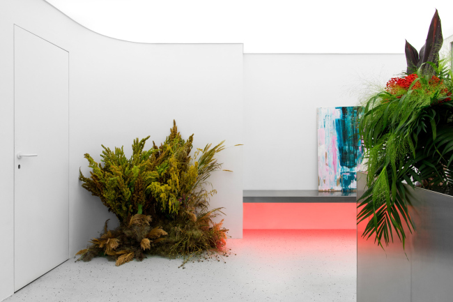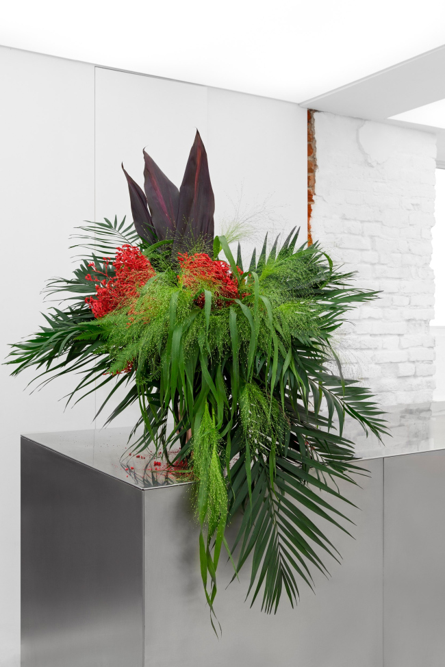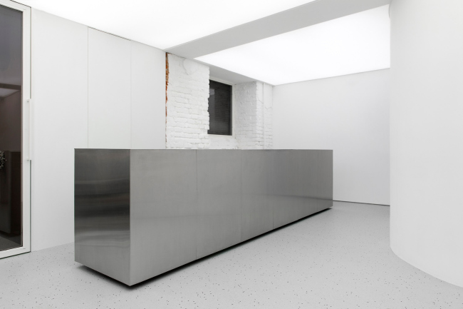 Центром зала стал четырехметровый рабочий стол из нержавеющей стали для воркшопов, обучения и подготовки цветочных композиций, который отделяет общественное пространство от рабочего. За ним располагается подсобное помещение и холодильная камера с цветами. Слева от стола – лавка из нержавеющей стали. В ожидании букета посетитель может посидеть на ней и почитать книги об искусстве и моде.