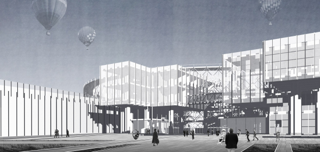 «В дореволюционное время на территории проектирования находился испытательный полигон аэростатов, впоследствии дирижаблей. Сейчас об этом напоминает железнодорожная станция «Воздухоплавательный парк». Именно образ воздушного судна, замершего в моменте отрыва от земли, послужил вдохновением для проекта.
