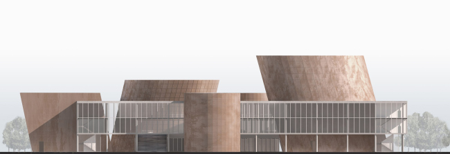 Образ создают пять глухих наклонных башен, объединенных строгим стеклянным объемом. В освещенных пространствах располагаются читальные залы и фойе, а в глухих – основные вертикальные коммуникации и фонды открытого доступа, для хранения которых важно отсутствие прямого солнечного света. В самой высокой башне находится концертный зал со вспомогательными помещениями. На кровле располагается живописный сад, где в теплую погоду можно провести время с книгой и просто погулять.