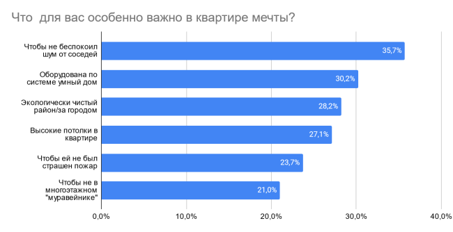 Так, 36% опрошенных рассказали, что в квартире мечты для них наиболее важен акустический комфорт – чтобы не беспокоил шум от соседей и с улицы. 30% считают, что идеальное жилье должно быть оборудовано системой “умный дом” и максимально автоматизировано. Для 28% важно расположение – в экологически чистом районе или за городом. Кроме того, 27% отмечают, что в квартире мечты обязательно должны быть высокие потолки. 24% опрошенных выбрали практичный подход и признались, что хотят жить в такой квартире, которой не страшен пожар. 21% высказались против многоэтажных “муравейников”.