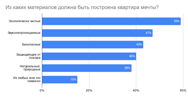 Как показал опрос, серьезную роль россияне уделяют материалам, которые используются при строительстве жилья. 59% считают, что идеальная квартира – это квартира в доме, который построен из экологически чистых материалов, для 47% важна звуконепроницаемость, для 43% – безопасность и безвредность. Кроме того, 40% хотели бы жить в доме, стены которого защищены от пожара, а 38% считают идеальным жилье из натуральных природных материалов. Лишь 15% признались, что квартира мечты может быть построена хоть из чего – для них это не имеет значения.