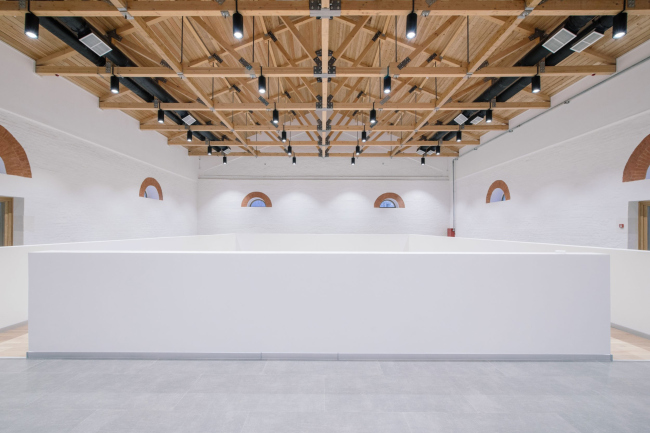 Отдельная история – потолок. Он и был стропильным, наклон кровли в проекте сохранен, только в каждый зал добавили по два зенитных окна. Собственно балки и стропила новые, это красивая конструкция, в основном из клееной древесины, не такая огромная и яркая, как в московском Манеже – вообще говоря, она стоит в ряду множества современных конструкций такого рода, это давно уже актуальный прием, – но о Манеже, учитывая перекличку в названии, все же напоминает. «Может быть и о питерском тоже», – уточняют авторы и становится понятно, что сходство с целым рядом музейных манежей тут, конечно, имелось в виду.