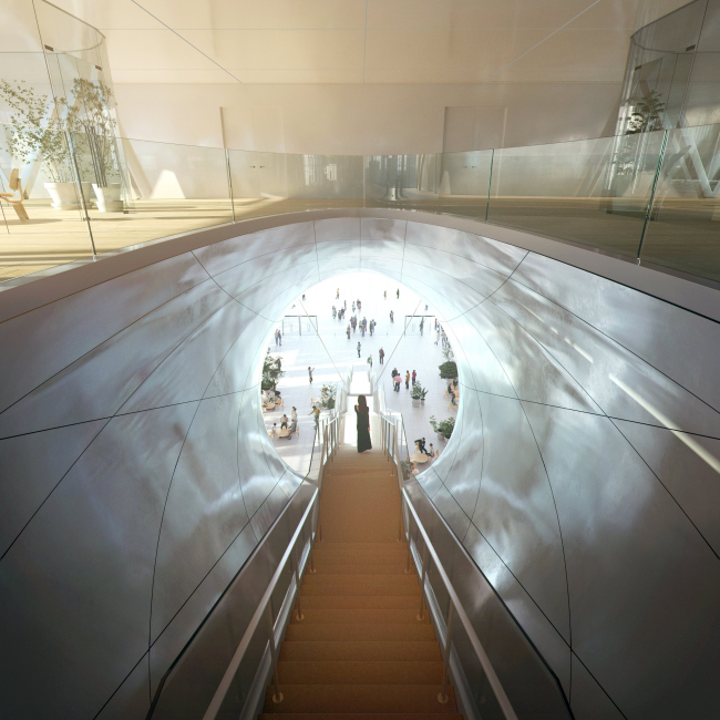 Чтобы максимально раскрыть наружу внутреннее пространство и сформировать общественную зону, западную стену склада также планируется убрать и заменить вдвинутой довольно глубоко внутрь полностью стеклянной «завесой». Сразу за прозрачной стеной располагается коворкинг и металлическая лестница в верхнюю часть, подвешенная на тросах. Она и правда несколько напоминает изображения Ноева ковчега. В неизвестное будущее надо будет пройти через некую пространственную дыру, вдруг раскрывшуюся в нижней части ковчега. Дополнительные трапы наверх установят со стороны набережной.