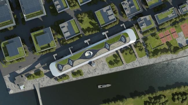 Используя значительную высоту (до 24 метров) и глубину склада, архитекторы запланировали здесь на разных уровнях зеленые зоны, кафе, торговые площади, исследовательский центр, в противоположном торце – универсальный зал для мероприятий, а на крыше, конечно же, еще одно общественное пространство. Поперечный коридор в центральной части позволит напрямую связать набережную с расположенным за заводом районом, а дополнительные проемы в нижней части речного фасада помогут раскрыть пространство вовне. Ну а через саму реку перекинут новый пешеходный мост.