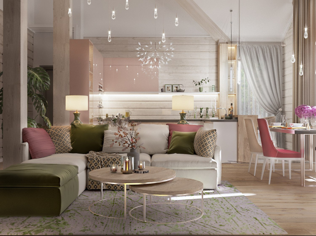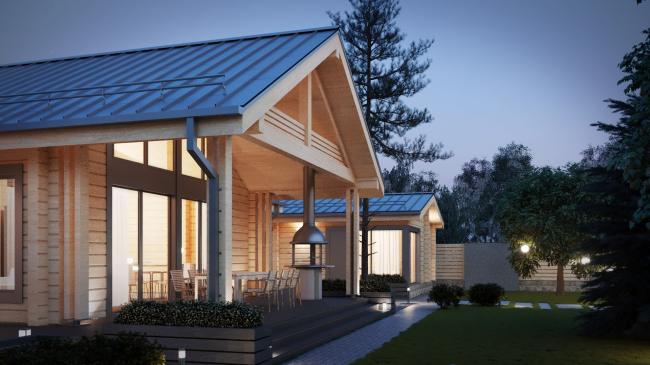 Из пояснительной записки: «Проект представляет собой комплекс дома из клееного бруса, который объединен общей террасой с баней. Окна в гостиной, простирающиеся от пола до потолка, пропускают естественный свет внутрь и, в сочетании с двухсветным пространством, создают умиротворенную атмосферу уюта. Панорамное остекление позволяет сделать интерьер в гармонии с окружающей природой и запустить красоту сада в дом».