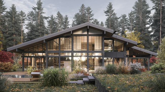 Из пояснительной записки: «Выразительность архитектуры достигается за счет лаконичности форм и натуральных материалов, применяемых в отделке здания: гонт, штукатурка и конечно же панорамным остеклением, которое формирует отражающую поверхность, растворяя дом в окружающей природе и лучах заходящего солнца. Остекление в этом современном eco-friendly доме заложено с точки зрения экономической целесообразности при реализации и дальнейшей эксплуатации дома».