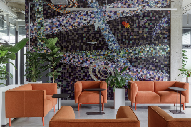 Школа креативных индустрий в Воронеже заняла необычное здание в форме матрешки. Авторы интерьерной концепции постарались сделать пространство функциональным, а также добавили связь с историей города: первый общественный этаж украшает мозаика и горельеф на космическую тему, которые в том или ином виде удалось спасти из снесенного ДК 50-летия Октября.