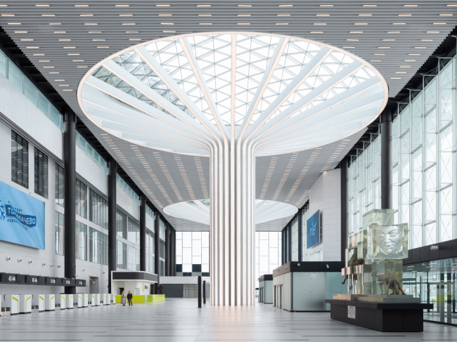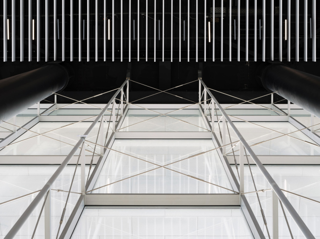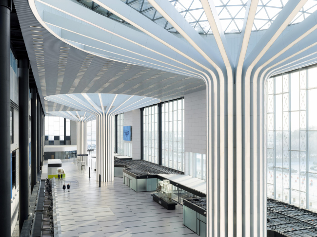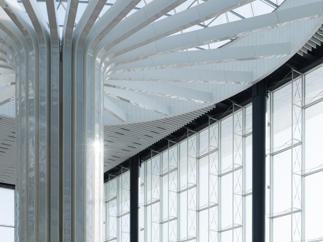 К другим технически пусть не запредельным, но ответственным решениям можно отнести козырек с большим выносом, ферму потолка, распределение нагрузки между основными колоннами-«деревьями» и дополнительными опорами, которые все же понадобились вдоль стеклянных фасадов. Но их не много, они высокие и тонкие, и не очень заметны.