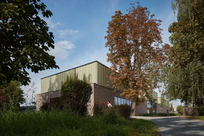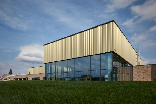Первый этаж здания получил в целом сдержанную отделку из кирпича, зато для второго архитекторы выбрали выкрашенные в золотой цвет металлические панели с ребристой фактурой и частичной перфорацией. Они позволяют визуально разбить объем, но особенно интересно это решение смотрится в лучах закатного солнца. Большие фрагменты остекления создают эффектные видовые «прострелы» и позволяют добиться ощущения пространственного единства. Во внутренней и внешней отделке также использованы многослойные клееные деревянные панели.