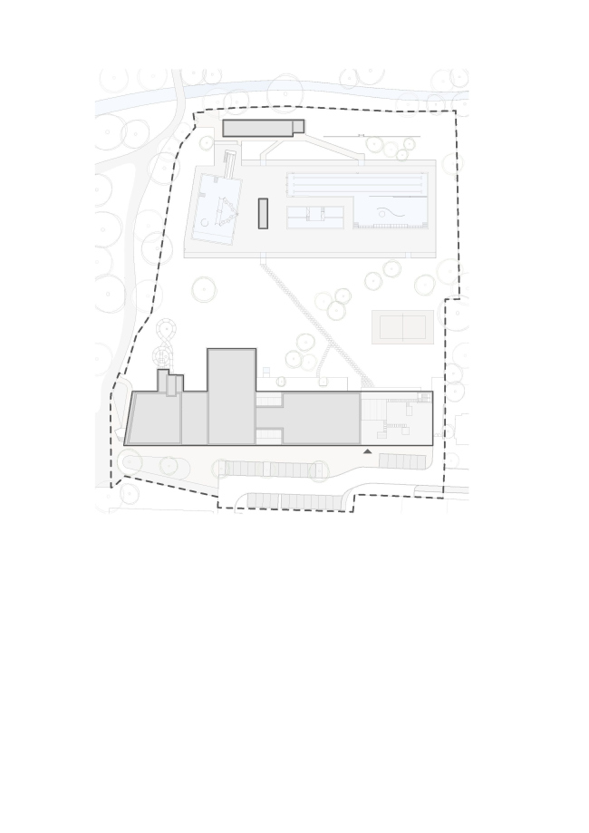 Положение нового объекта весьма удачно не только в плане исторической преемственности и соседства с уже имеющимися популярными рекреационными объектами (парк и стадион). Ванна главного «уличного» 50-метрового бассейна вытянута вдоль реки, а второй, детский мелкий бассейн обращен в сторону парка. Основной двухэтажный корпус стоит параллельно дороге, защищая обращенную в сторону реки территорию. При этом крытый 25-метровый бассейн противостоит этой оси, он повернут на 90º и активно выдвинут вперед, становясь одновременно и частью открытой зоны.