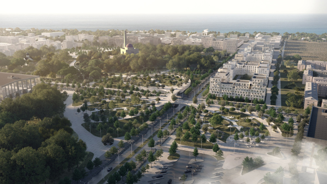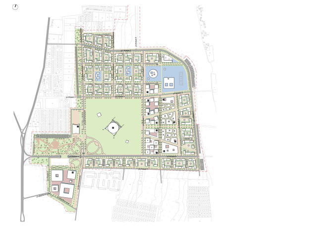 Улично-дорожная сеть учитывает многообразие возможных сценариев в новом микрорайоне. Транспортное полукольцо позволяет подключить его к существующим улицам, а регулярная квартальная сетка позволяет варьировать ежедневные маршруты и гибко перенаправлять движение без ущерба комфорту резидентов. Например, в случае пятничной молитвы, привлекающей много верующих, или визита первых лиц в административный блок, когда неизбежно ограничение движения.
