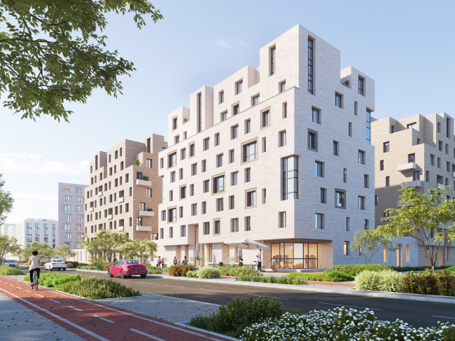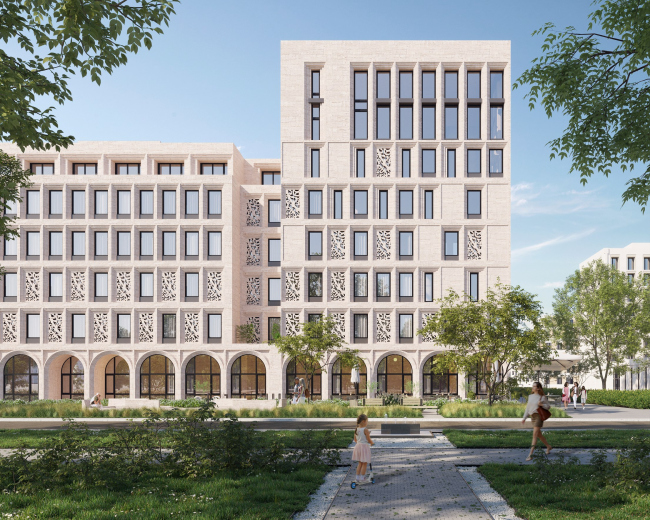 Оставшееся место заполняют среднеэтажные жилые кварталы и деловой центр. Как уже было сказано, они подчинены иерархии, определяющую роль в которой играет близость к духовному центру. Типологию каждого квартала архитекторы подчеркивают с помощью пластических и декоративных решений, зафиксированных в дизайн-коде. Еще один влиятельный фактор – солнце, которое бывает здесь очень жарким: чтобы помещения не перегревались, архитекторы варьировали глубину откосов, расположение балконов и высоту секций. Террасы встречаются скорее как исключение для того, чтобы разнообразить квартирографию и сформировать более выразительный силуэт: по мнению ОСА, летними помещениями в России люди пользуются не часто даже в регионах с жарким климатом.