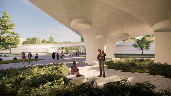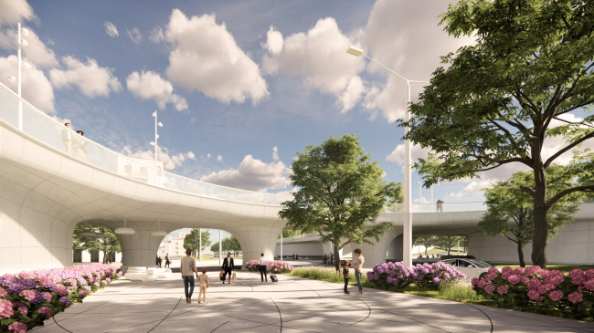 Связующим звеном всех трех кластеров и точкой входа для приезжих является пешеходный мост, формирующий разветвленную систему безбарьерных променадов. Для поиска формы этого элемента в бюро проходил внутренний конкурс.