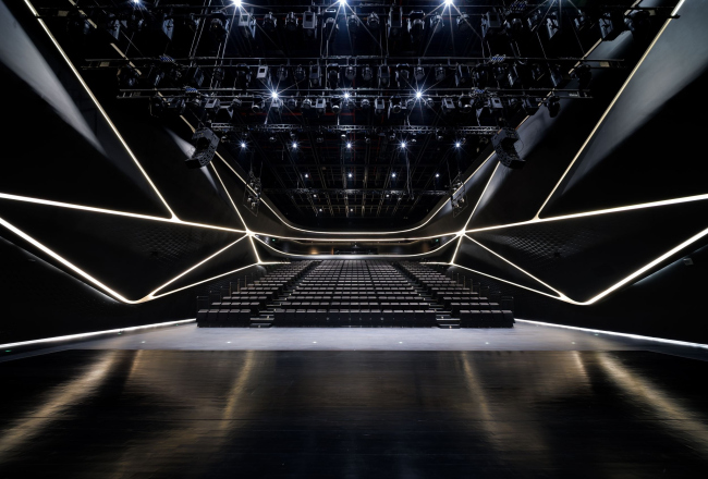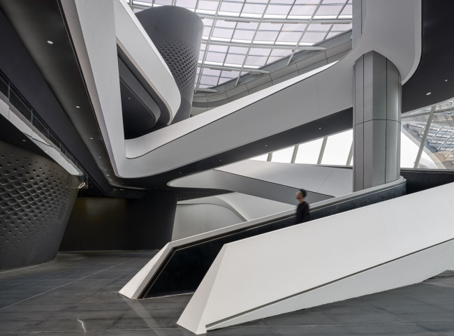В интерьере Большого театра использован центральный звездчатый мотив кровли. Посетители художественного музея направляются по белой зигзагообразной лестнице за чёрный волнообразный «занавес»: там скрыты выставочный зал, запасник и административные помещения.Общественный центр искусств ЦзиньваньФото © CAT-OPTOGRAM STUDIO