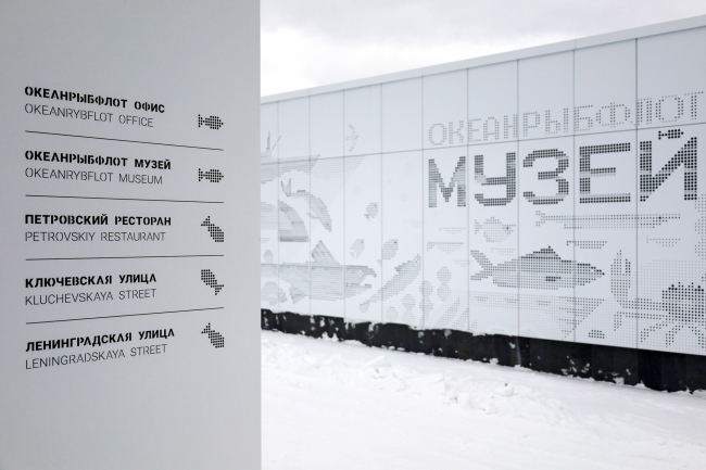 Цвета, выбранные для музея АО «Океанрыбфлот», отсылают к уникальной природной среде Камчатки: Белый – цвет снега и морской пены; Чёрный – вулканическая лава и песок океанических пляжей; Синий – цвет безграничного неба и океана.