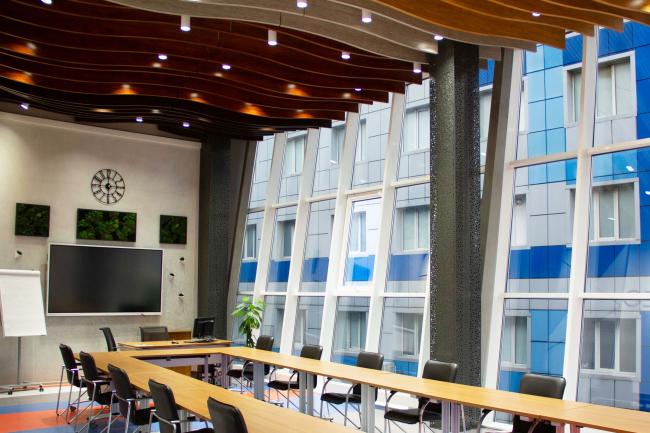 Кроме стильного интерьерного решения, в помещениях появились новые технологичные решения. Беспроводные презентационные системы в Аудитории позволяют одновременно демонстрировать на экране видео, документы и изображения.
