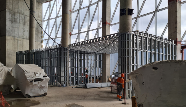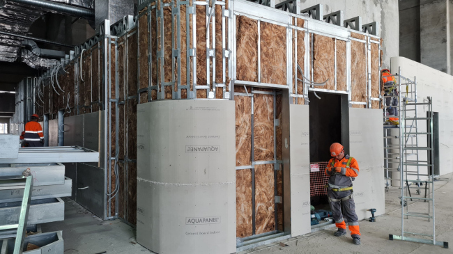 «Технология КНАУФ КУБО представляет собой каркасно-обшивные конструкции, где в качестве силового каркаса выступает ЛСТК-профиль с обшивкой листовыми материалами КНАУФ, между слоями обшивки стена заполняется минеральной ватой», – отметил Великодный. На СКА-Арене у каждого помещения КНАУФ КУБО было свое уникальное объемно-планировочное решение, и в этом заключалась сложность проекта.