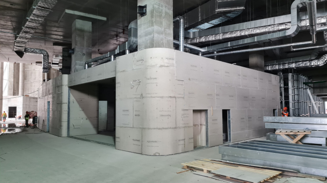 При строительстве дворца в Санкт-Петербурге для обшивки КНАУФ КУБО использовались влагостойкие цементные плиты АКВАПАНЕЛЬ®. Также они поставлялись для облицовки других систем сухого строительства, что способствовало ускорению сроков проведения работ, поскольку монтаж внутренних конструкций возможно было безопасно выполнять вне зависимости от погодных условий.