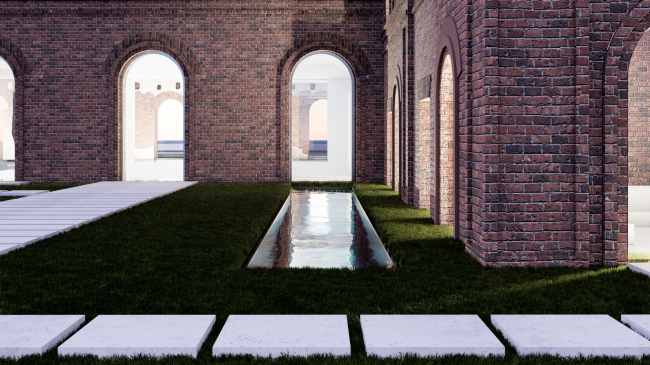 Первое необычное: здание предполагается «зафиксировать» в нынешнем виде, проведя необходимые реставрационные и укрепительные работы, сохранив ощущение руины. Но не заброшенной, а ухоженной, оцененной по праву старшинства и красоты. Все проемы, даже если они не соответствуют виду на момент постройки, сохраняются и заполняются сплошным остеклением без импостов – издалека может показаться, что они пустые. На ту же идею работает прозрачная кровля.