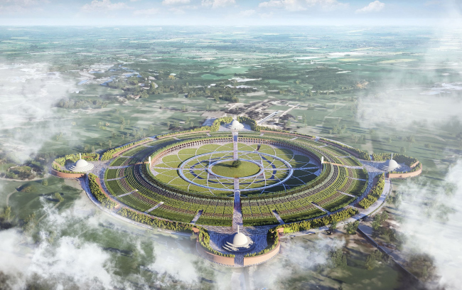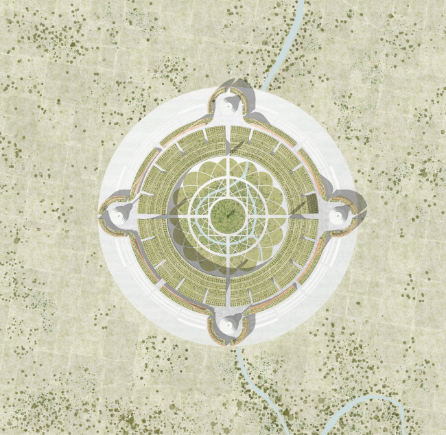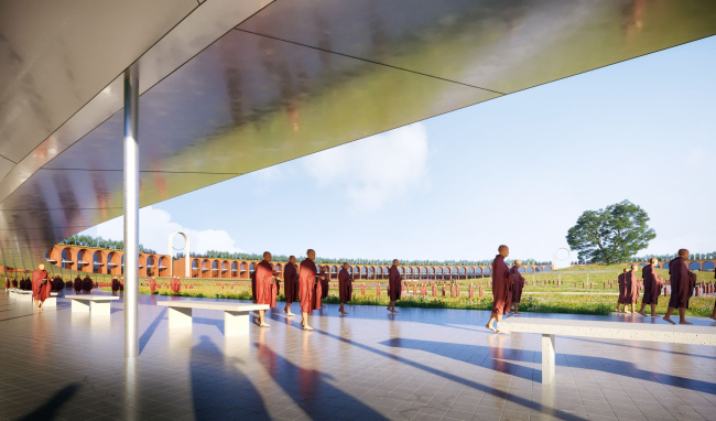 Мастерплан основан на схеме мандалы, то есть он симметричен по четырем осям и включает концентрические окружности. Собственно холм со ступой под ним и с деревом бодхи на вершине останется нетронутым, в том числе ради будущих археологических исследований. Вокруг создадут Луг мира (600 м в диаметре) с дорожками, позволяющими паломникам приблизиться к холму. Далее на спускающейся вниз насыпи разобьют Кольцевой сад биоразнообразия, где высадят 80 тыс. растений 70 видов, в основном характерных для тераи – алювиальных равнин, где расположена ступа. Внешний периметр комплекса образует кольцевая аллея, затененная деревьями: тема тени, учитывая климат этой части Непала, была ключевой для проекта.