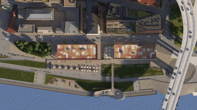 Но жизнь, как известно, идет вперед, и вместо остатков заводских зданий запланирован культурный центр, – его автор, Александр Дехтяр, предложил поставить в ряд два здания близкого масштаба: одно наследует ангару, другое размещается ближе к мосту. А между бетонными быками он перебрасывает мостик смотровой площадки с окнами в полу, которые позволят видеть воду не только вокруг, а и под ногами тоже.