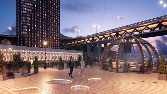 Определенно, приречная инсталляция хороша, тем более что там задумана беседка с камином, и от второго корпуса туда ведет наклонный пешеходный мостик – аттракцион для склона набережной. Тут можно вспомнить и старую заводскую перемычку, но, не только ее, намного больше мостик перекликается с самим Метромостом.