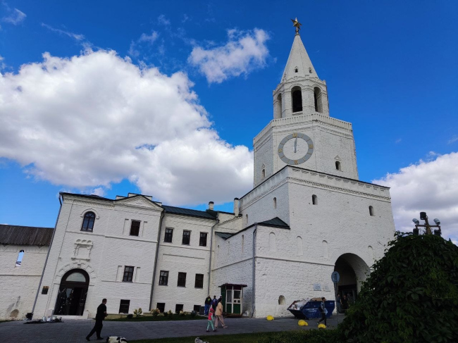 Белокаменная Спасская башня с надвратной церковью Спаса Нерукотворного – главный въезд в Кремль, один из символов Казани. Построена в середине XVI веке для хранения реликвий штурма города русскими войсками в 1552 году. В разные века объект достраивали, меняли въезд в крепость. В 1963 году на башне появились электрические часы с циферблатами и автоматическим боем, а также пятиконечная звезда на шпиле.