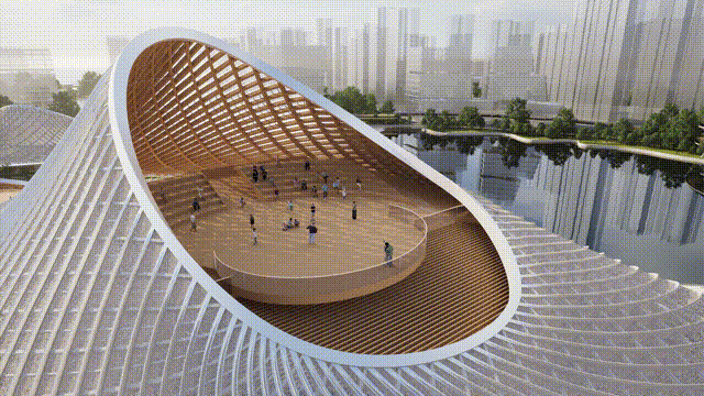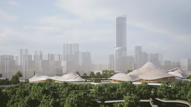 Главным связующим элементом станет полупрозрачная защитная кровля из полимерной мембраны, которой накрыты все объекты. Она позволит создать на разных уровнях множество общественных пространств с патио и террасами, куда будут интегрированы магазины, кафе, заведения стрит-фуд. Это важный момент, так как навесы – характерный элемент традиционной архитектуры региона, а возможность собираться вместе – основополагающая часть местного образа жизни. Ма Яньсун называет и еще две традиции провинции Гуандун, которые он учитывал при создании проекта, стараясь передать их динамику и ритм: гонки на драконьих лодках и так называемый танец львов.