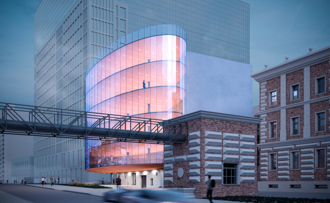 Мне не понятны две вещи: первое, почему Михаил Дмитриев не ссылается на строящееся рядом, в 400 метрах отсюда, здание кампуса МГТУ, о стремлении которого к современным архитектурным решениям и о стеклянном дворе было уже немало сказано и показано? Ведь овальный офис-аквариум в какой-то момент может показаться прямо-таки осколком кампуса, задуманного если не как футуристический, то как современный точно. Или его общежития, тут, с другой стороны Яузы. В районе Бауманских уже сделано заметное высказывание в сторону предпочтения современной архитектуры, самое время к нему примкнуть.