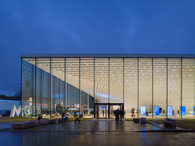 Юлий Борисов также говорит о лаконичной форме павильона как о способе не спорить с окружающими зданиями. С одной стороны это верно, прозрачный фасад, или даже, по словам архитектора, «отсутствие фасада» – не колоннада и не портик. С другой стороны, мне тут видится доля лукавства – ярким и заметным павильон не перестает быть. Только делает это иначе.