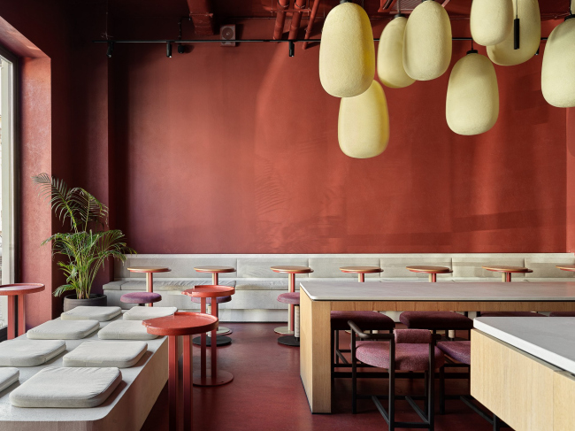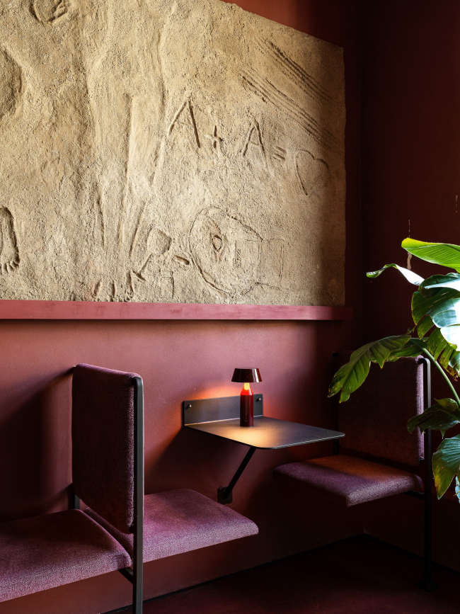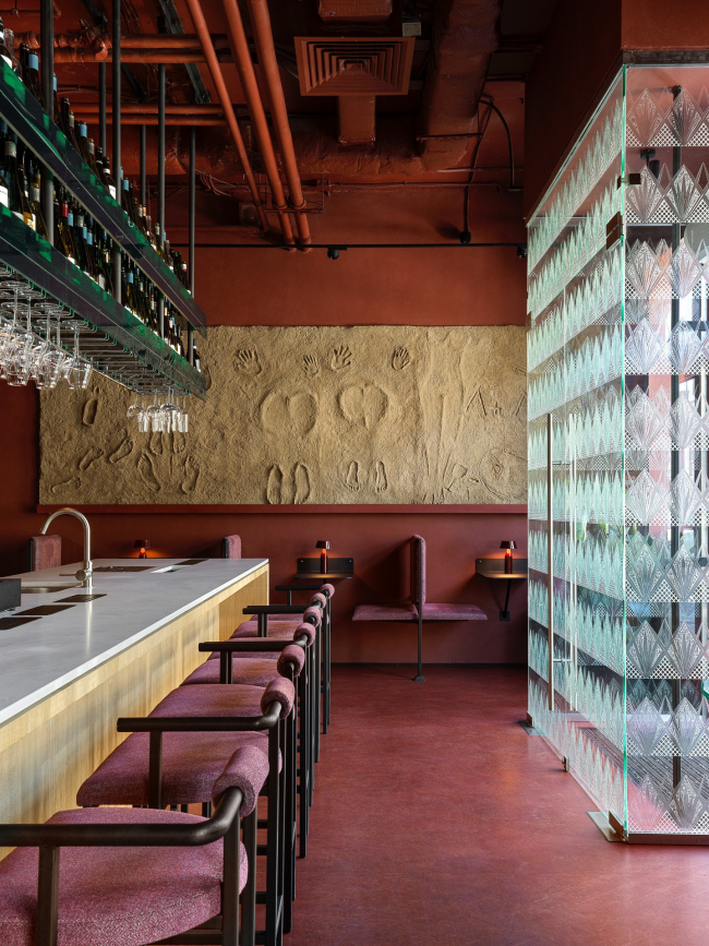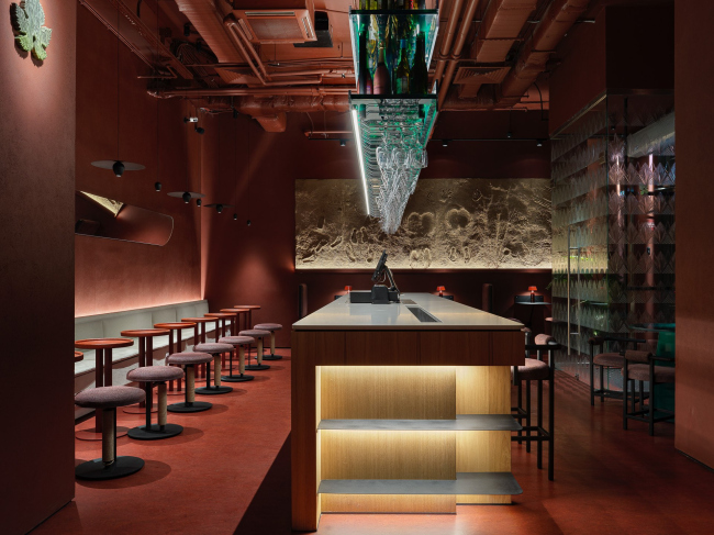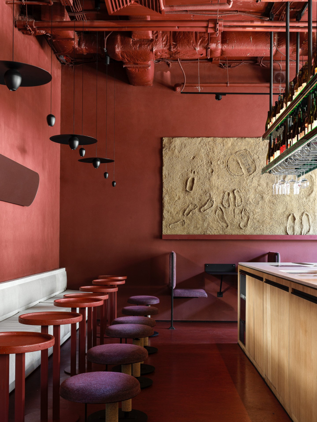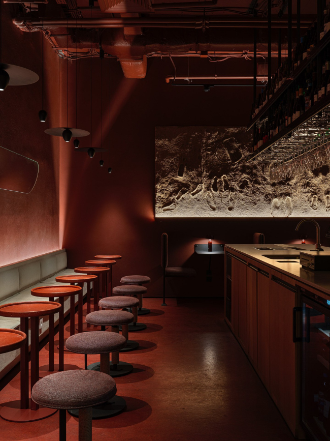 Описание предоставлено архитекторами Винный бар открылся на главной туристической улице Казани. Перед авторами интерьера стояла задача создать раскрепощающую атмосферу, которая настроит посетителей получать удовольствие от вина, еды и общения. Для пола, стен и потолка был выбран единый карминный оттенок, который дает ощущение закатного солнца: в это время человек оставляет дела позади и может позволить себе расслабиться.
