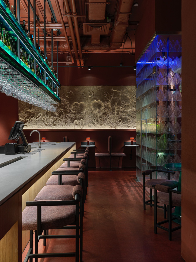 Панно из песка рассказывает легкую романтическую историю, произошедшую на пляже. При этом сама текстура песка, выделенная скользящим светом, создает эмоциональный образ земли, дарами которой наслаждаются гости бара.