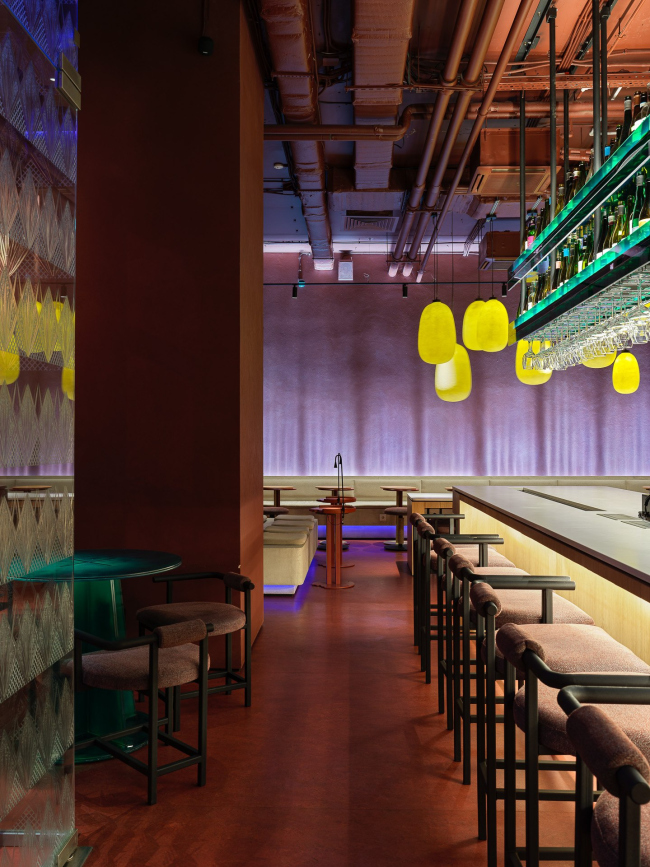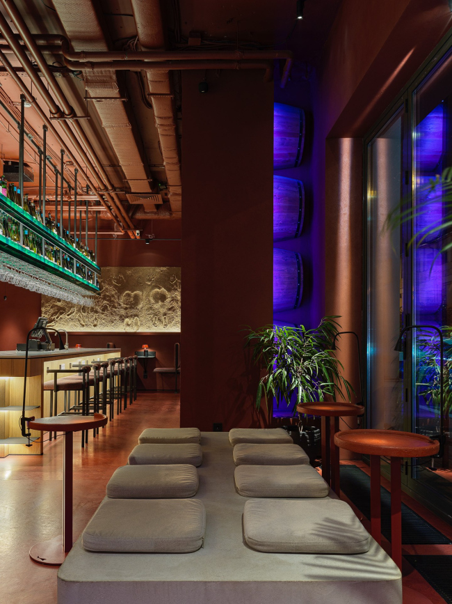 Поскольку поводов забежать на бокал красного бывает много, архитекторы постарались учесть в планировочном решении все потребности гостей. Большой стол и стойка бара располагают к общению. У стен сосредоточена гибкая посадка с мягкими диванчиками, на которые можно сесть потеснее и сдвинуть столы, расположиться по одному, парами или небольшими компаниями. Также предусмотрены столы на двоих с подвесными столиками. На постаменте с подушками при случае можно потанцевать.