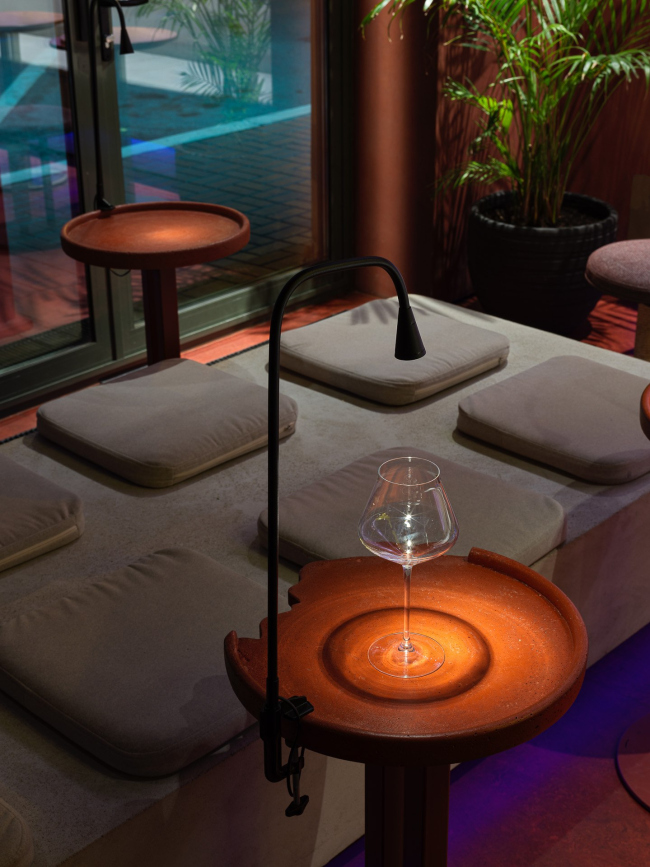С помощью световых акцентов выделены несколько бетонных столиков с неровным краем, которые привносят нотку истории. Светильник над коммунальным столом – отсылка к пронизанным солнцем спелым виноградинам. На одной из стен с помощью светильника сымитирован эффект играющих бликов света, как от напитка в бокале. Световой акцент привлекает внимание и к бочкам, наполовину скрытым за дверью винного погреба.