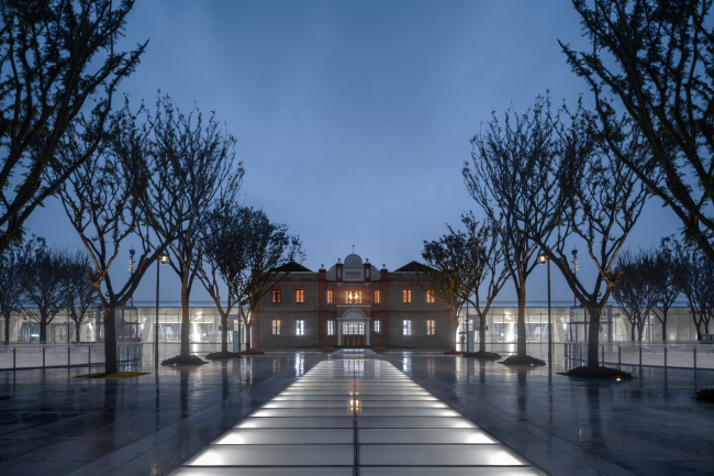 Воссозданное здание стало центральной точкой всей строго осевой композиции комплекса. С северной стороны к нему можно подойти через городской парк, который архитекторы сохранили и расширили, посадив еще около 1500 деревьев (секвойи, вишни, клены, сальные и камфорные деревья). Центральная аллея засажена буками, они через несколько лет разрастутся и своими кронами сформируют подобие перекрытия. С противоположной стороны, перед южным входом, возвели семь круглых корпусов коммерческого и культурного назначения, соединенных утопленными внутренними дворами, тоже круглыми. В центре создали холмистый газон общей площадью около гектара. Это общественное пространство может использоваться для проведения концертов и фестивалей.