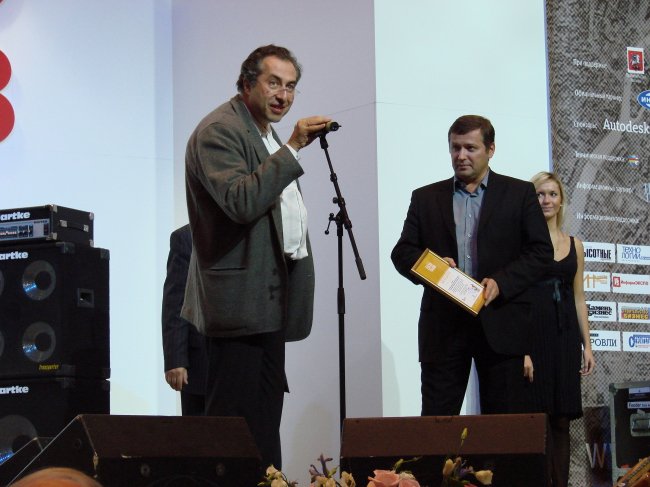 Вообще говоря, намечавшийся на стендах построек/проектов успех Петербурга состоялся и в наборе дипломов – со сцены практически не сходили Михаил Мамошин и Никита Явейн. Среди золотых дипломов за постройки – «дом у моря» Евгения Герасимова / Сергея Чобана и станция "Строгино" Метрогипротранса. Среди серебряных дипломов – «Живописный мост» Николая Шумакова (Метрогипротранс), реставрация «Кузьминок», конгресс-холл республики Башкортостан. Бронзы удостоили горнолыжную «трубу» – центр всесезонных видов спорта в Красногорске Михаила Хазанова (что для такой постройки мне кажется маловатой наградой), а также здание Владимира Юдинцева на Цветном бульваре, построенное на месте снесенного доходного дома (что для этого дома мне кажется наградой несколько преувеличенной, доходный дом был так себе, но лучше), и многофункциональный комплекс на ул. Академика Павлова в Петербурге Михаила Мамошина. Перед тем, как вручить дипломы, председатель жюри по постройкам Виктор Логвинов определил проекты как «душу», а постройки как «душу вместе с телом» - хорошее сравнение, дающее повод для спекуляций – интересно например, в какой постройки больше души, а в какой больше тела, или еще хорошо будет сказать про какой-нибудь дом – «в чем душа держится».