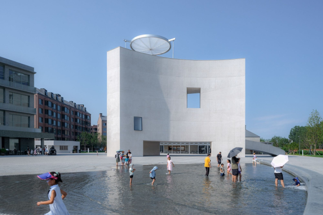 Новое здание, тем не менее, выделяется своей цельной, самодостаточной формой и способностью организовывать пространство вокруг. Каждый из трех вогнутых фасадов формирует свою общественную зону, а территория под приподнятым над землей зданием служит для защиты отдыхающих от жары или ливня, при этом не мешая их свободному движению по площади.