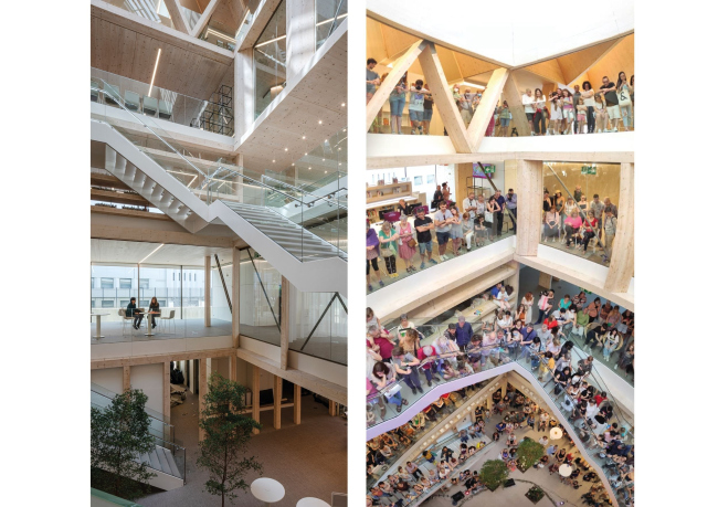 Система вторичного использования воды, садики для поддержания биоразнообразия (птицы, насекомые, летучие мыши), открытые в интерьер инженерные сети служат наглядным пособием для учеников.