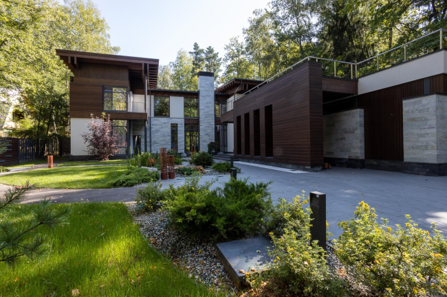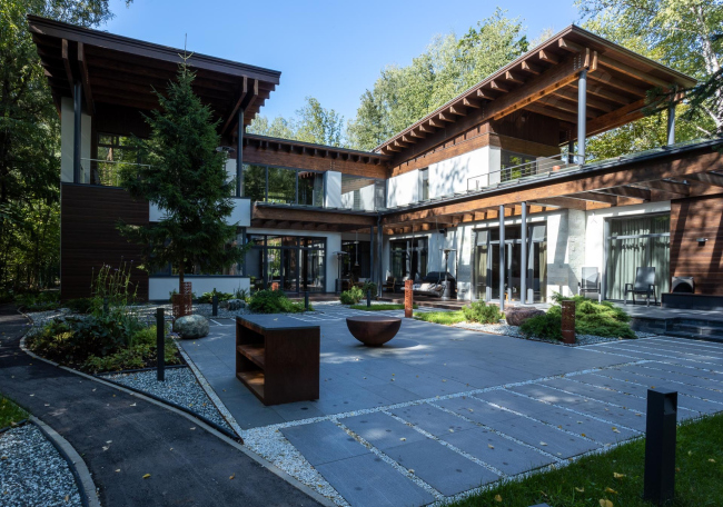 Дом не стали делать ни высоким, ни компактным, а наоборот – широко развернули его зигзагом примерно на половину участка. Это позволило добиться приватности, поскольку большая часть объемов осталась скрытой за деревьями, а также пространственного разнообразия: благодаря не вполне стандартной конфигурации образовалось два больших двора – парадный и «семейный», а впридачу к ним – множество уголков, дающих простор для затей ландшафтного дизайна. Им, к слову, тоже занималась мастерская Романа Леонидова.