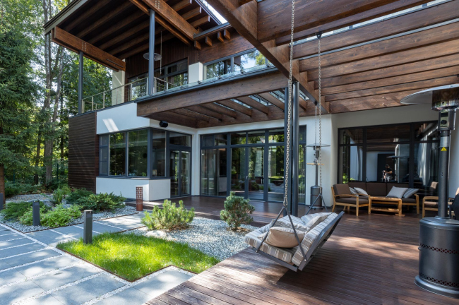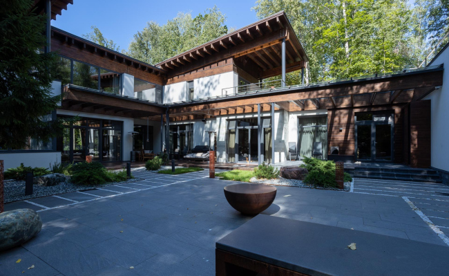 Сердце всей композиции и место, где члены семьи встречаются друг с другом чаще всего – внутренний двор. Широкую веранду от солнца и дождя защищает пергола со стеклянной крышей. Под ней – качели, обеденная зона, а рядом – площадка для игр, барбекю и ландшафтные композиции. Круглому столику из кортеновской стали вторят ажурные светильники, сделанные специально под проект.
