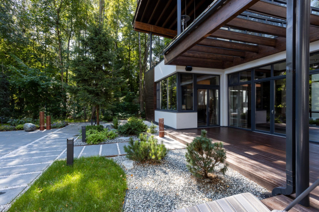 Попасть на участок можно через калитку или въездные ворота, которые ведут в холодный гараж, соединенный с техническими помещениями – кладовой, гардеробной, постирочной. Слева от этого блока располагается галерея: она защищает посетителя от непогоды и подводит к парадному крыльцу. Забегая вперед отметим, что всего в доме 10 входов-выходов. Еще одна функция галереи – уравновешивать блок мезонина, облицованного той же лиственницей, а сверх того – предлагать альтернативный пространственный опыт: можно пройтись по мощеной дорожке, наслаждаясь простором, а можно обозревать сад через «рамы» проемов.
