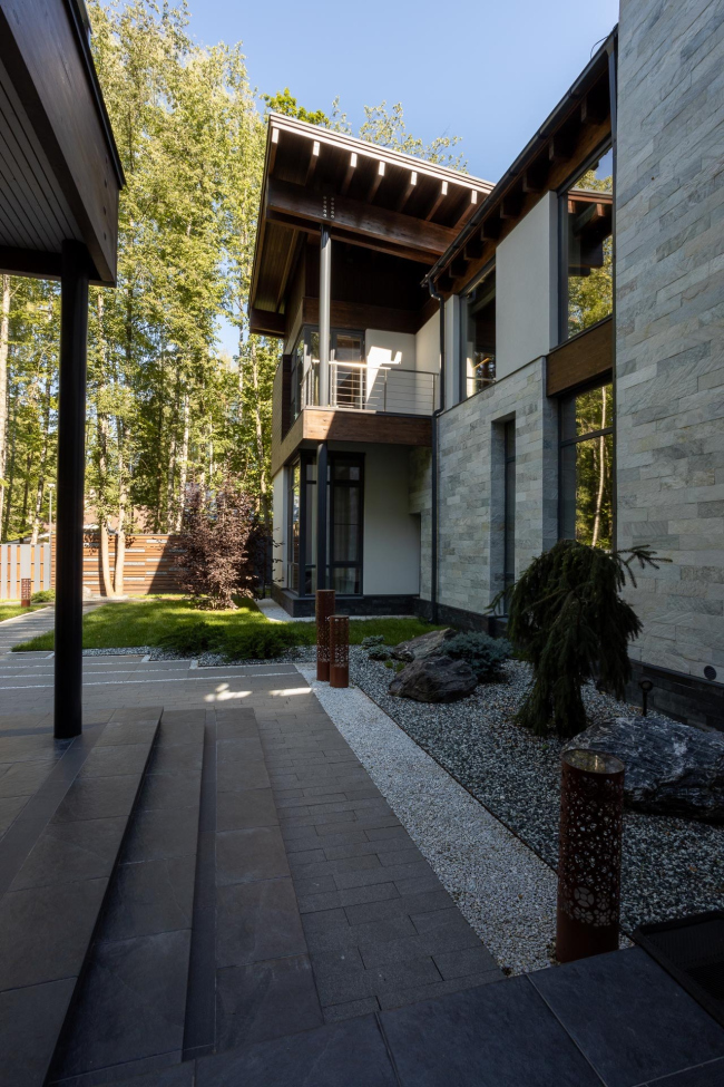 Дорожка уходит в глубину участка, где прячется беседка и отдельный домик для помощников, а затем возвращается к двухэтажной части комплекса – сердцу всей композиции и средоточию семейной жизни.