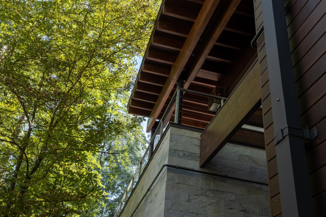 У дома три основных тона – светлая штукатурка, серый сланец или кварцит, бронзового отлива дерево. Эти традиционные для бюро материалы помогают понять структуру дома, поскольку каждый функциональный блок на фасаде проявлен своим цветом или фактурой, а выраженные горизонтали подчеркивают ярусы и собирают все элементы в единую композицию. Динамика линий соответствует характеру заказчиков – энергичных людей с деловой хваткой.