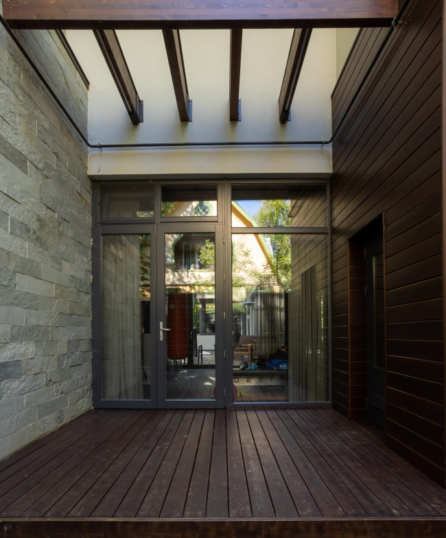 Дорожка огибает дом слева, где он придвинут к границе участка на максимально возможное расстояние. На эту сторону ориентирован еще один технический блок, внутри которого располагаются котельная, кладовая, спортивный зал и спа-зона с баней и хаммамом. Архитекторы постарались сделать привлекательной и эту часть усадьбы: на «задворки» выходит микротерраса с остекленным входом в спортзал, через который просматривается второй приватный двор, а в ограде напротив него сделана акцентная вставка из планкена лиственницы со встроенными светильниками. Вместо них предполагались ящики с растениями, но в процессе реализации стало понятно, что они потребуют слишком много ухода.