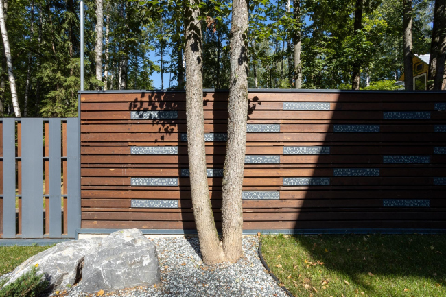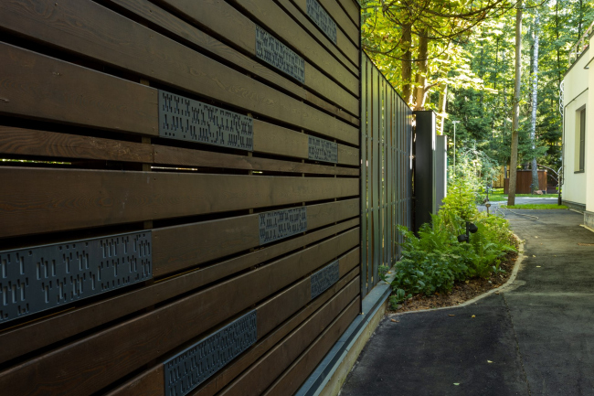 Для ограды использовались металлические листы, которые со стороны соседей с их согласия «подшили» оставшимся планкеном лиственницы. Эти двухслойные проницаемые сегменты чередуются с глухими горизонтальными вставками